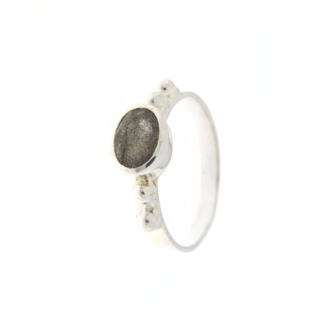 The silver ring has a faceted cut gemstone. The gemstone has an oval shape with a size of 8 x 6 mm.