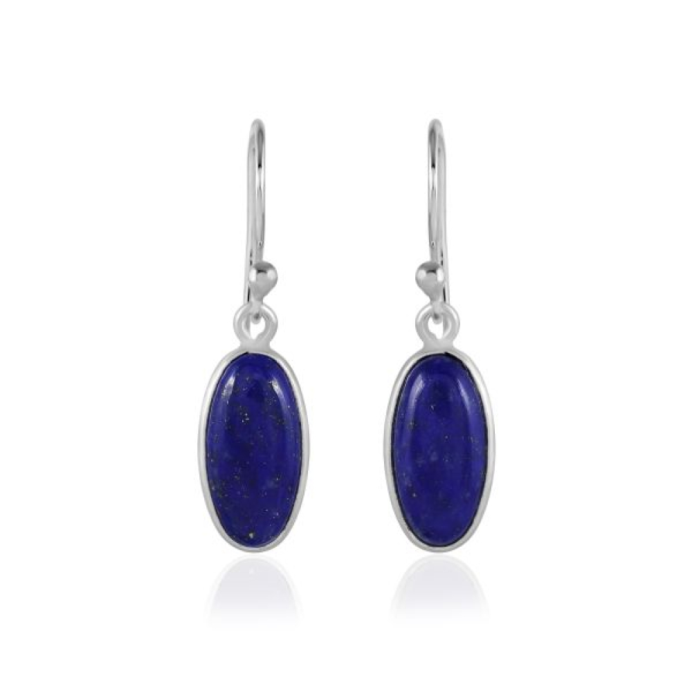 The silver hanging earring has a cabouchon cut gemstone. The gemstone is oval-shaped with a size of 14 x 8 mm.