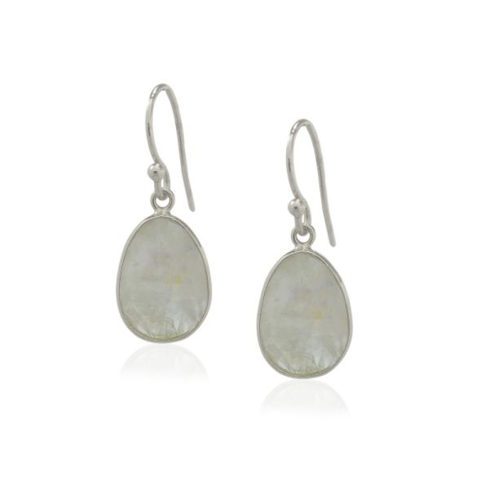 The silver hanging earrings have faceted cut gemstones. The shape of the gemstone is irregular with a size of approximately 16 x 12 mm.
