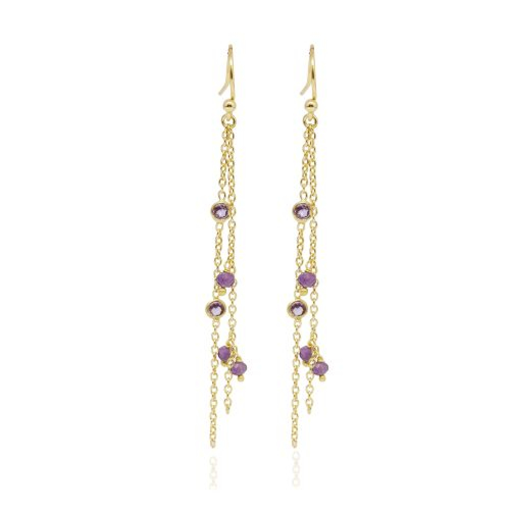 The goldplated hanging earrings have faceted cut gemstones. The shape of the gemstones are round shaped with a size 4 mm.