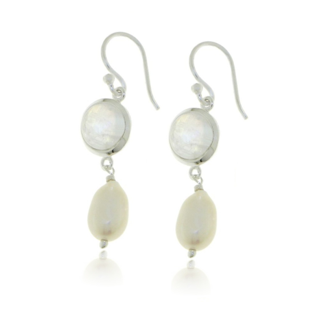 The silver hanging earring has cabouchon cut gemstones. The gemstone is round with a size of 8 mm with a pearl underneath.
