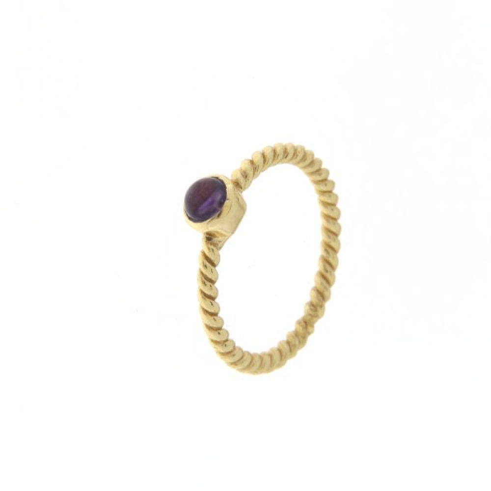 The goldplated on silver ring has a cabouchon cut gemstone. The gemstone has a round shape with a size of 4 mm.