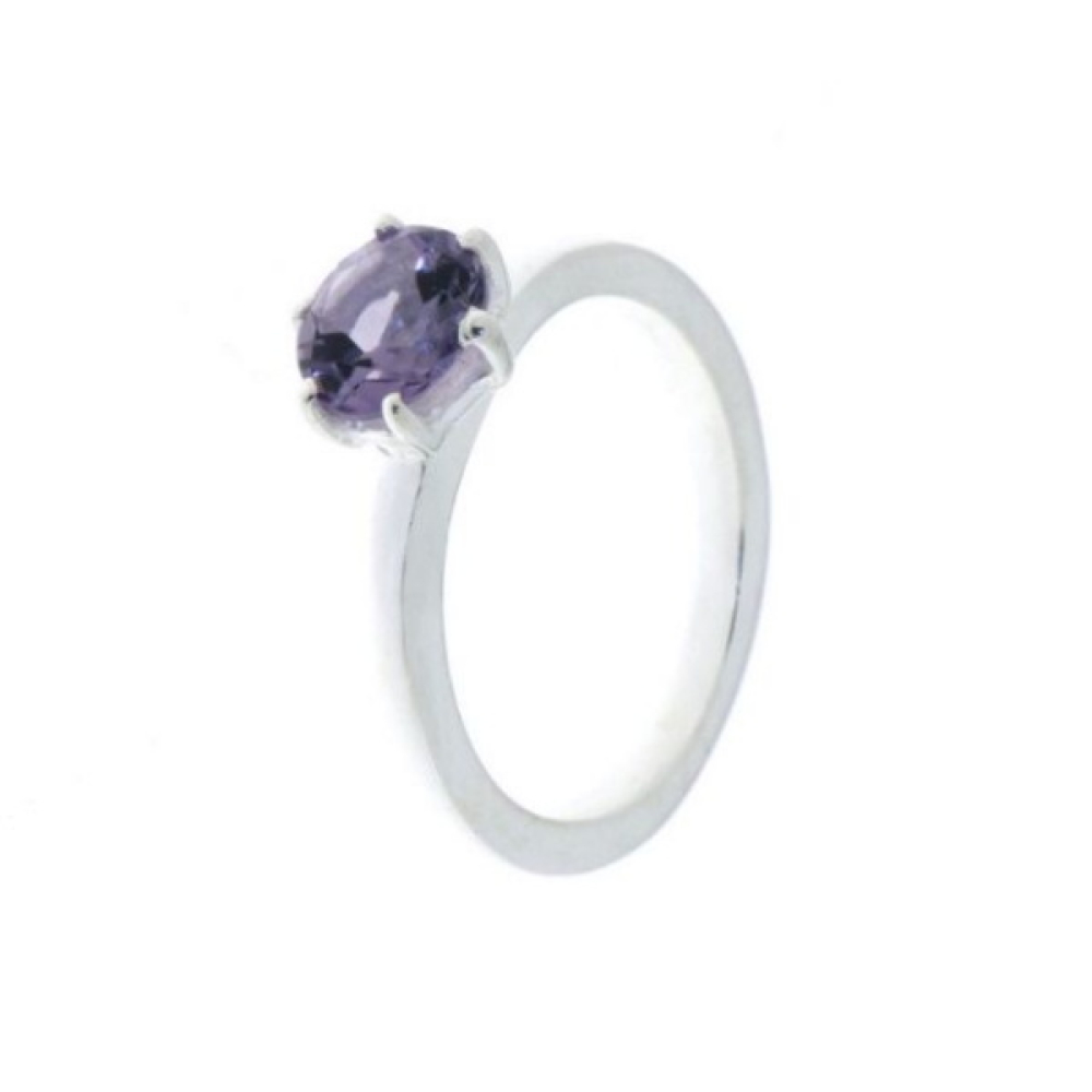 The silver ring has a faceted cut gemstone. The gemstone has a round shape with a size of 7 mm.