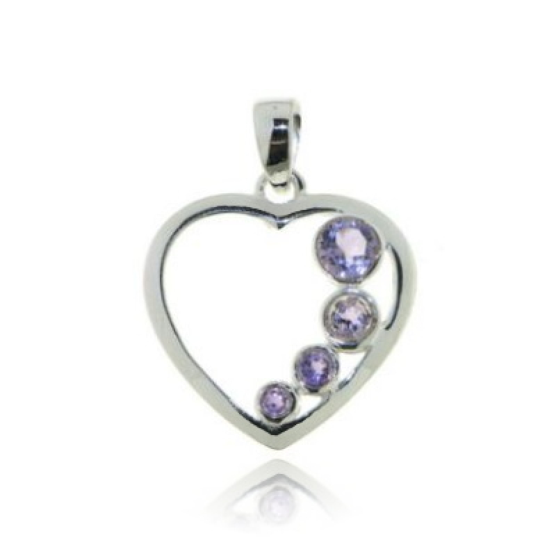 The silver heart shaped pendant has faceted cut gemstones. The shape of the gemstones are round with different mm sizes. The following gemstones are set in the pendant: Blue Topaz, Peridot, Amethyst and Garnet.