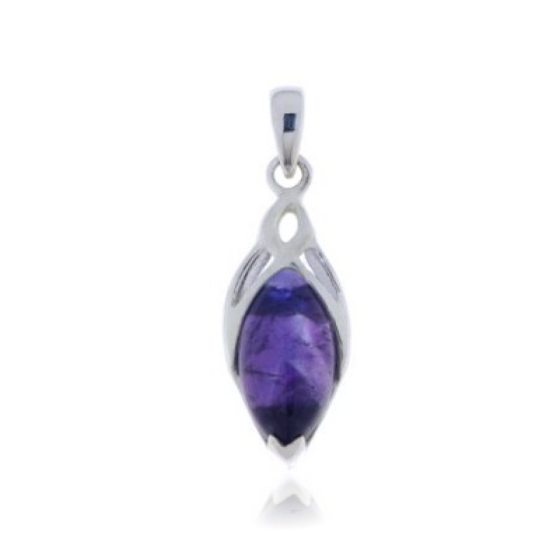The silver triskel pendant has a cabouchon cut gemstone. The gemstone has an marquise shape with a size of 14 x 8 mm.