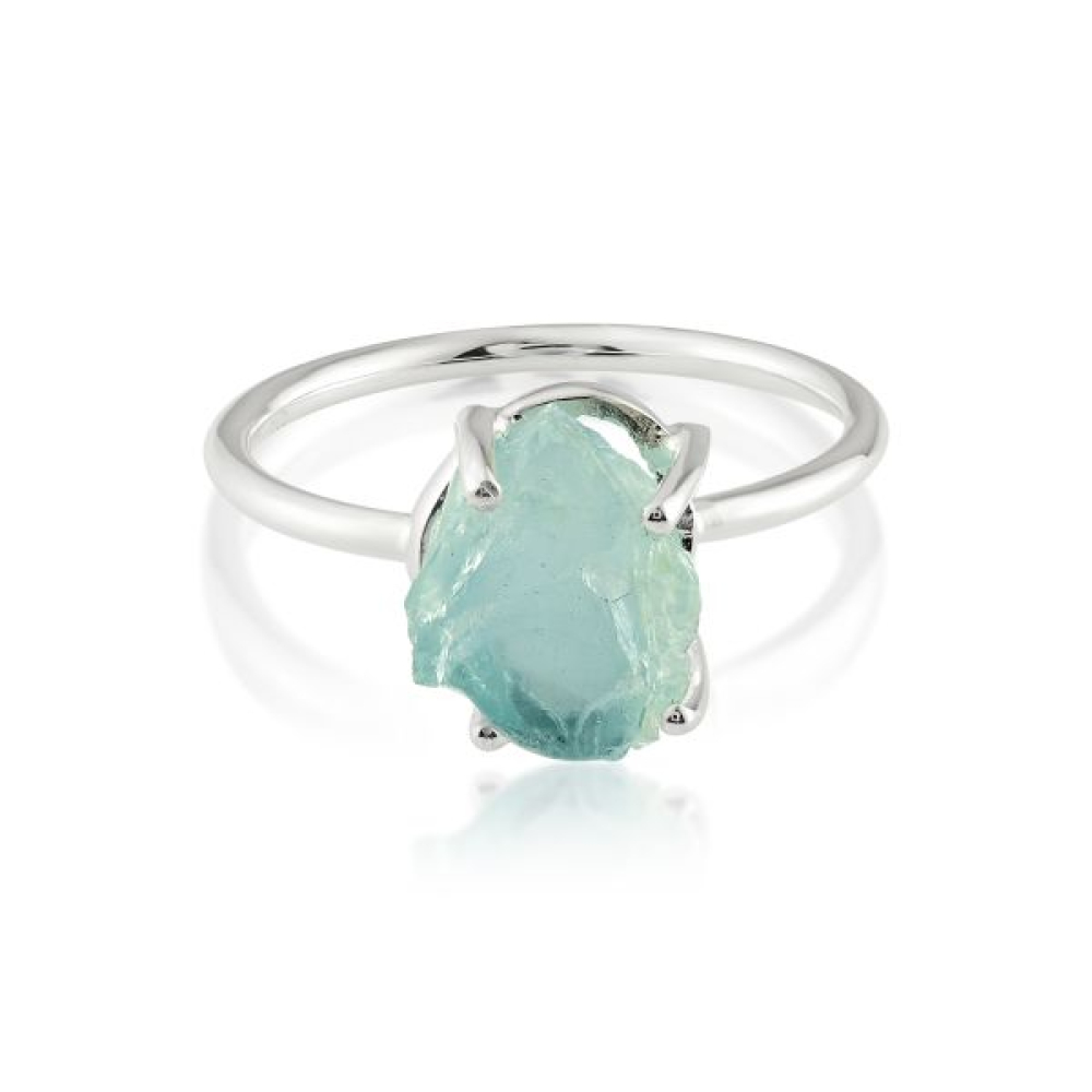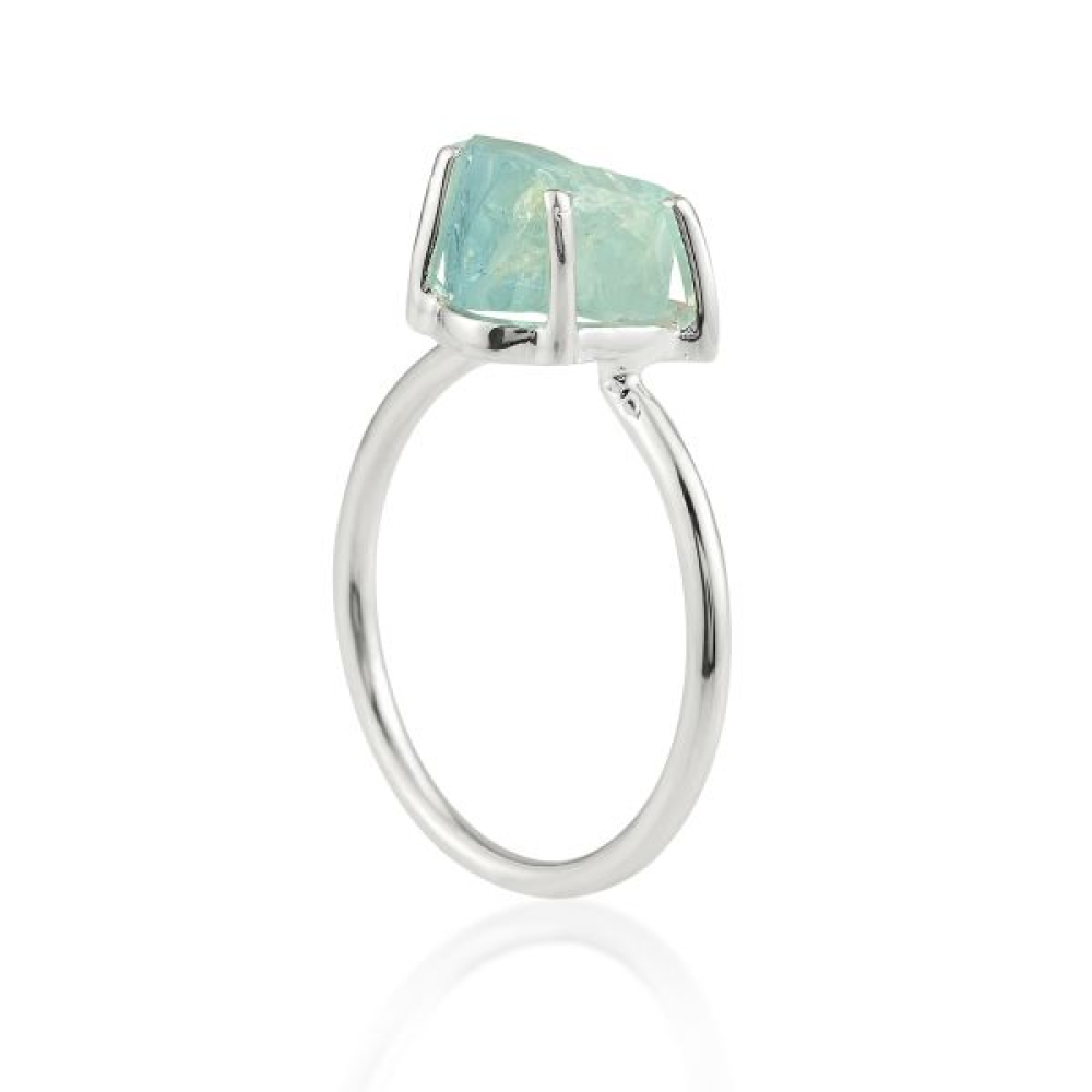 The silver ring has a rough gemstone. The gemstone has an oval shape with a size of 10 x 8 mm.