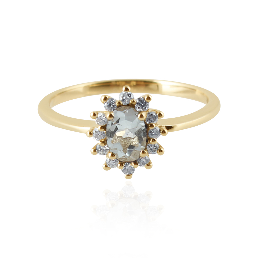 The 14 carat golden ring has a faceted cut gemstone. The shape of the gemstone is oval with a size of 6 x 4 mm.