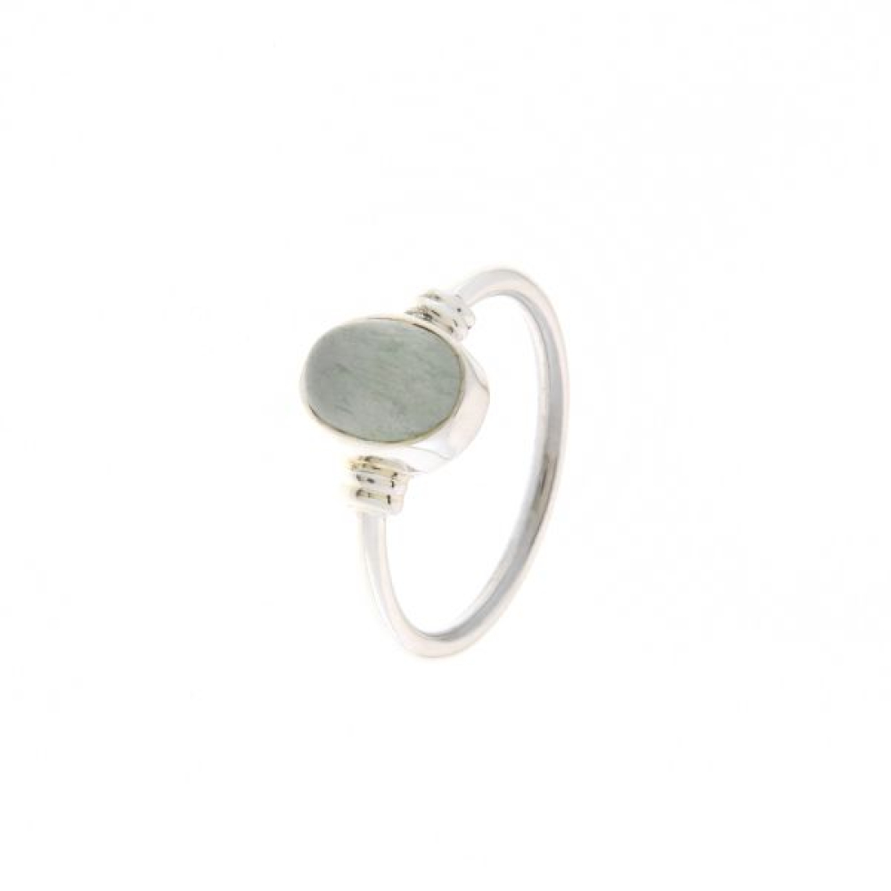 The ring has a cabouchon cut gemstone. The gemstone has an oval shape with a size of 8 x 6 mm.