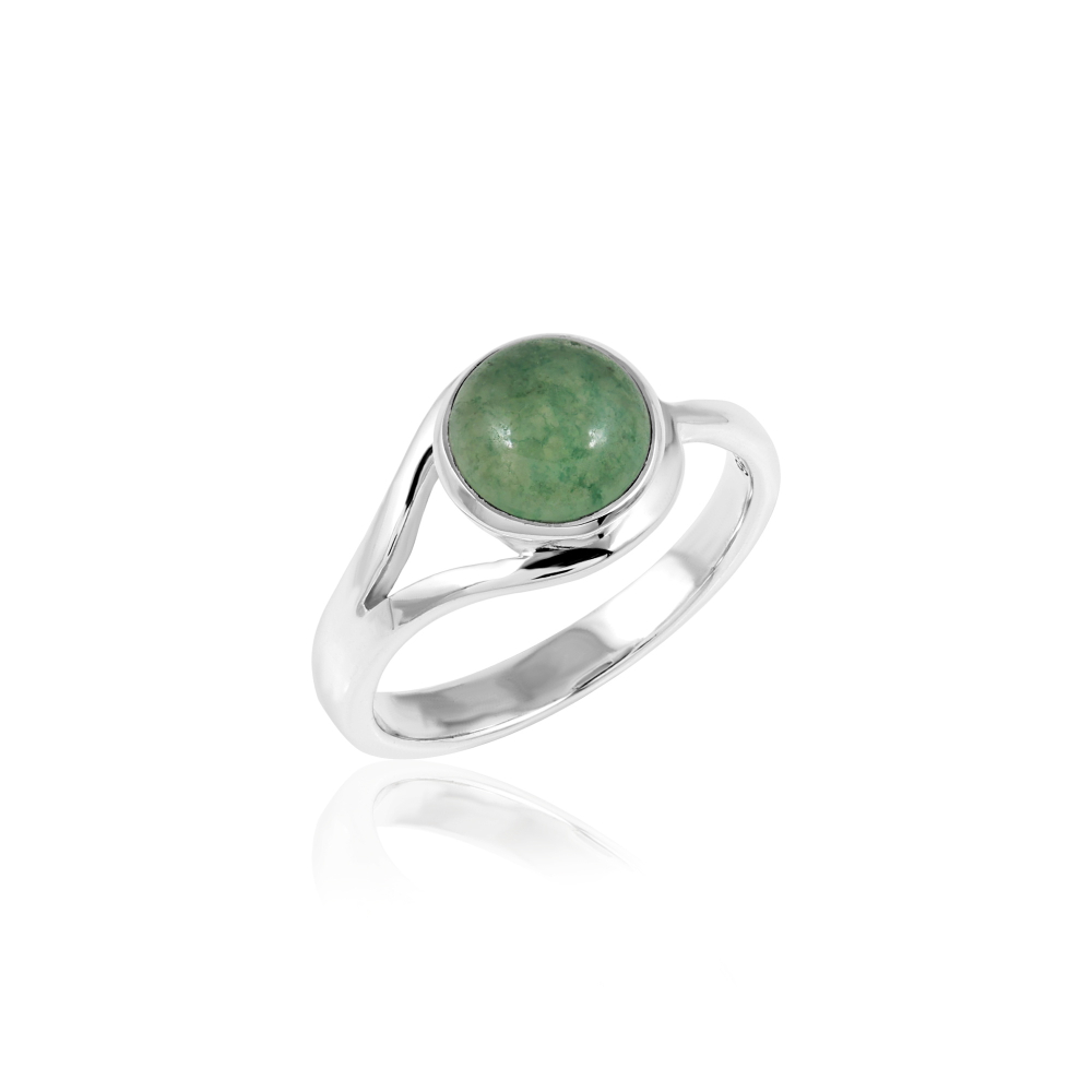 The silver ring has cabouchon cut gemstones. The shape of the gemstone is round with a size of 8 mm.