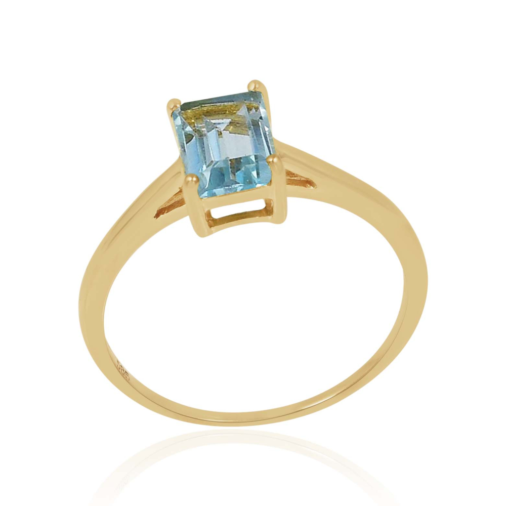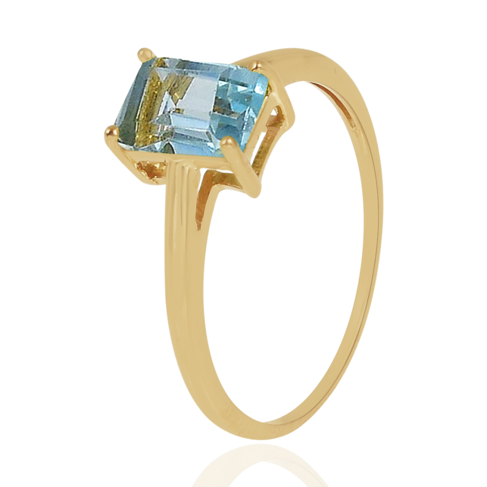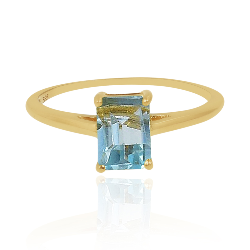 The 14 carat golden ring has a faceted cut gemstone. The shape of the gemstones are rectangulat with a size of 7 x 5 mm.
