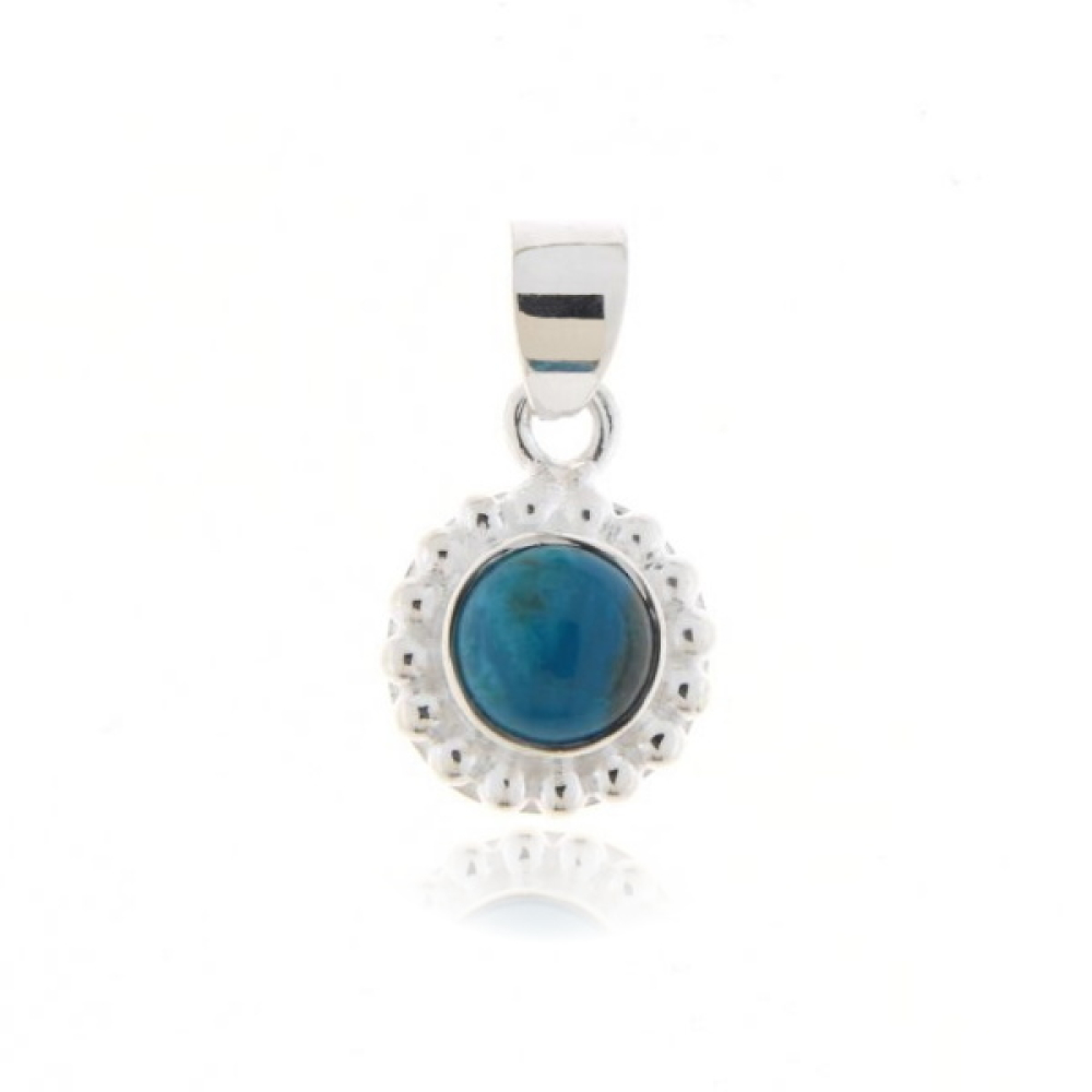 The silver pendant has a cabouchon cut gemstone. The shape of the gemstone is round with a size of 6 mm.