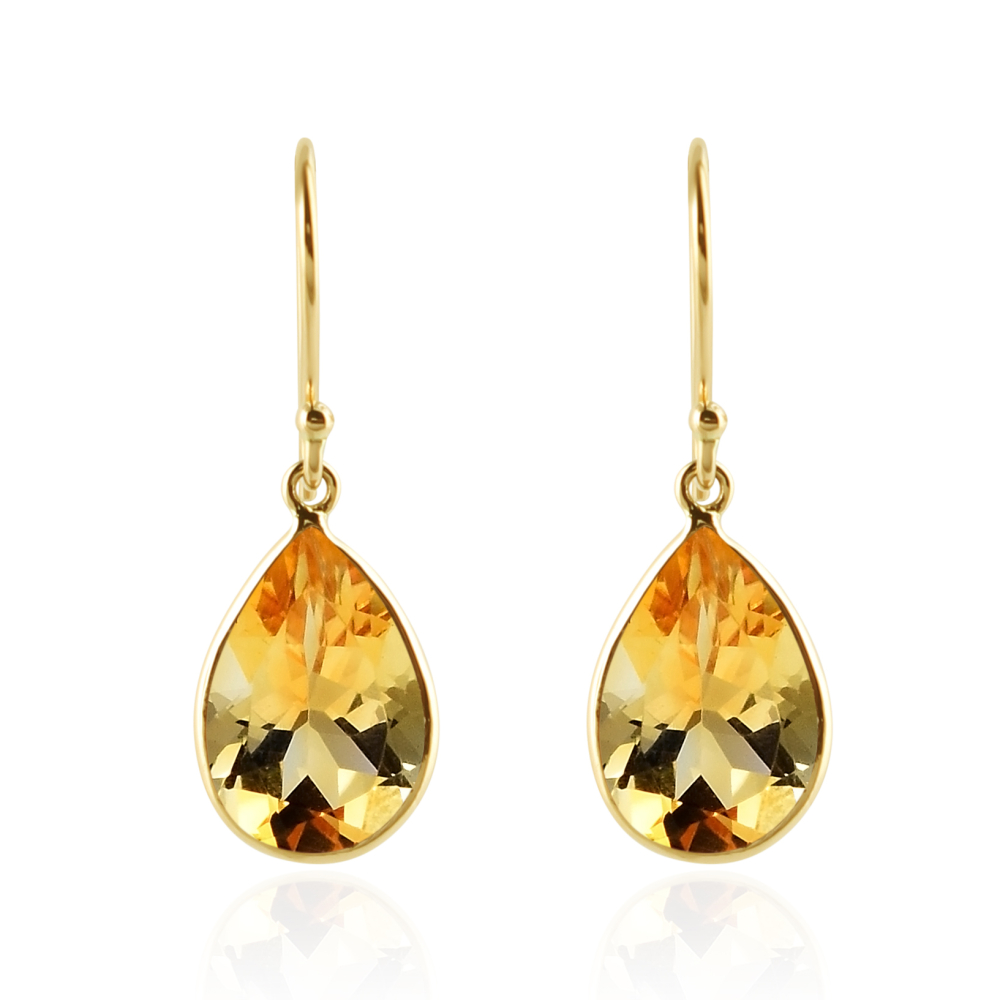 The 14 carat golden hanging earrings have faceted cut gemstones. The shape of the gemstones are drop shaped with a size of 12 x 8 mm.