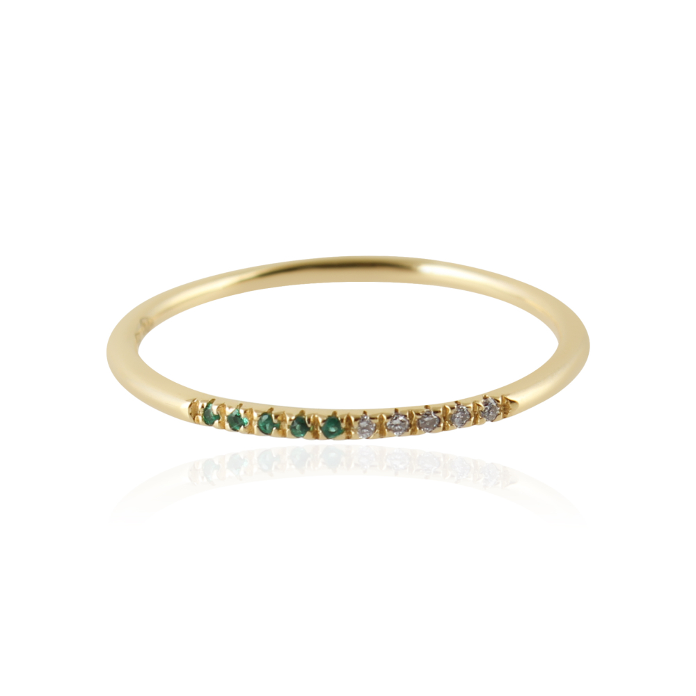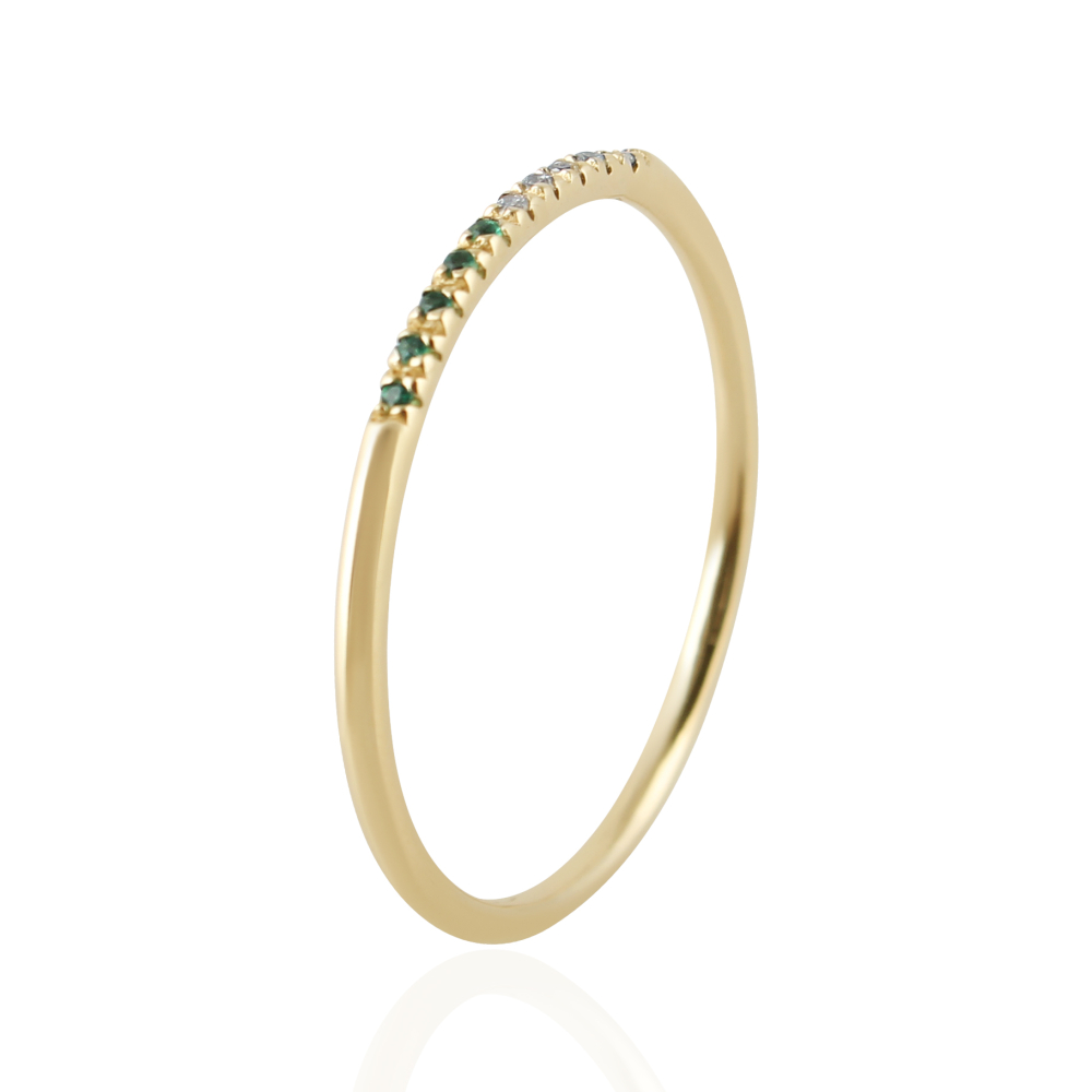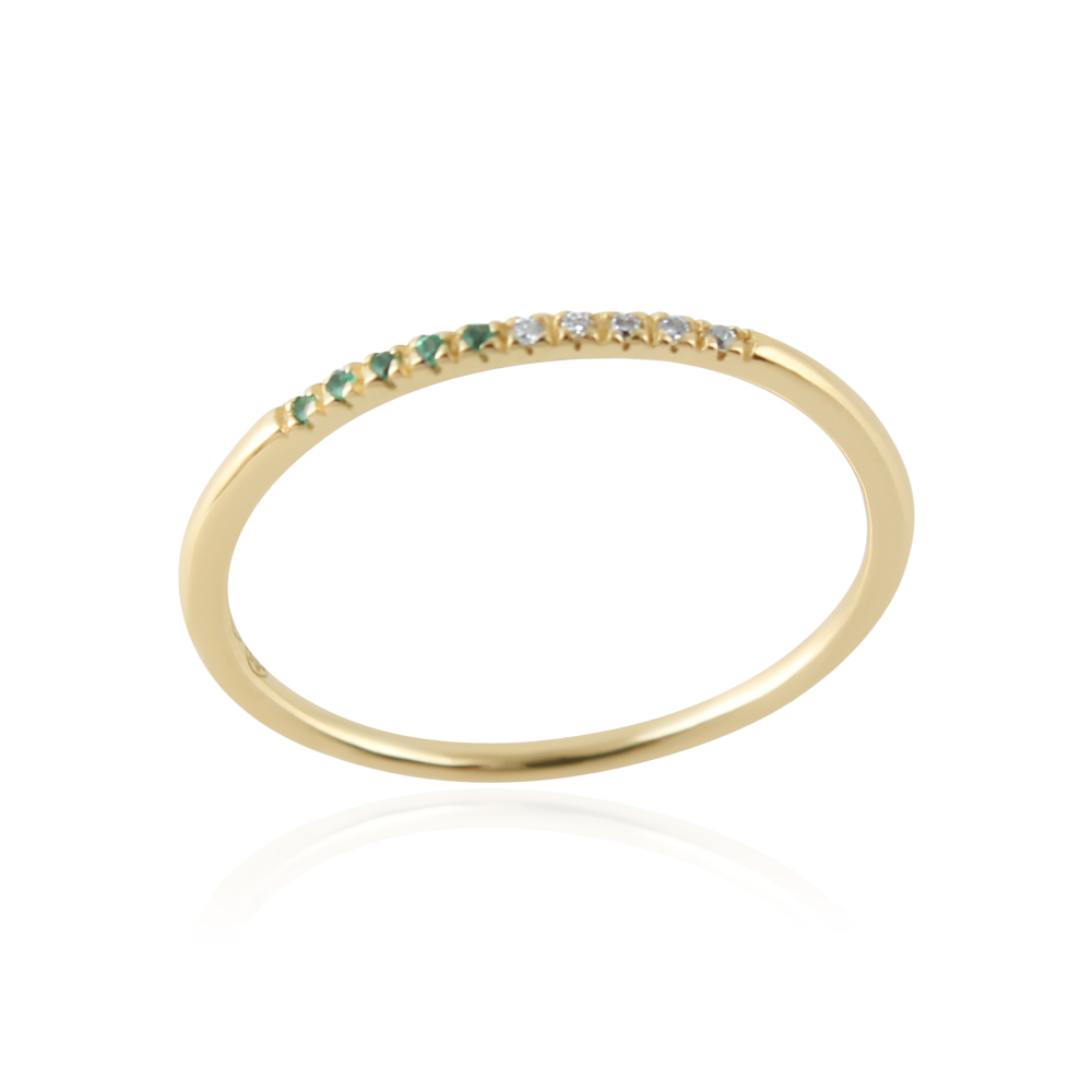 The 14 carat golden ring has faceted cut gemstones. The shape of the gemstones are round with a size of 1 mm.