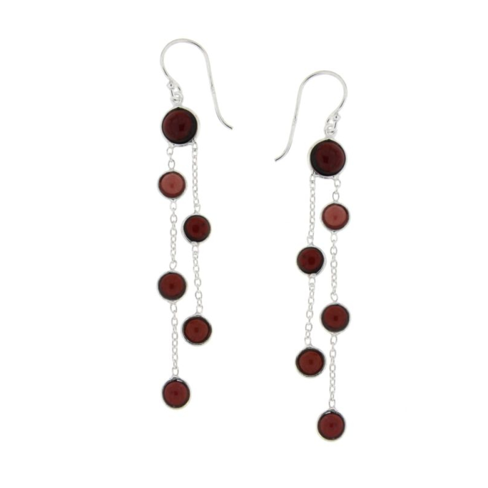 The silver hanging earrings hava cabouchon cut gemstones. The gemstones have a round shape with sizes of 7 mm and 5 mm.