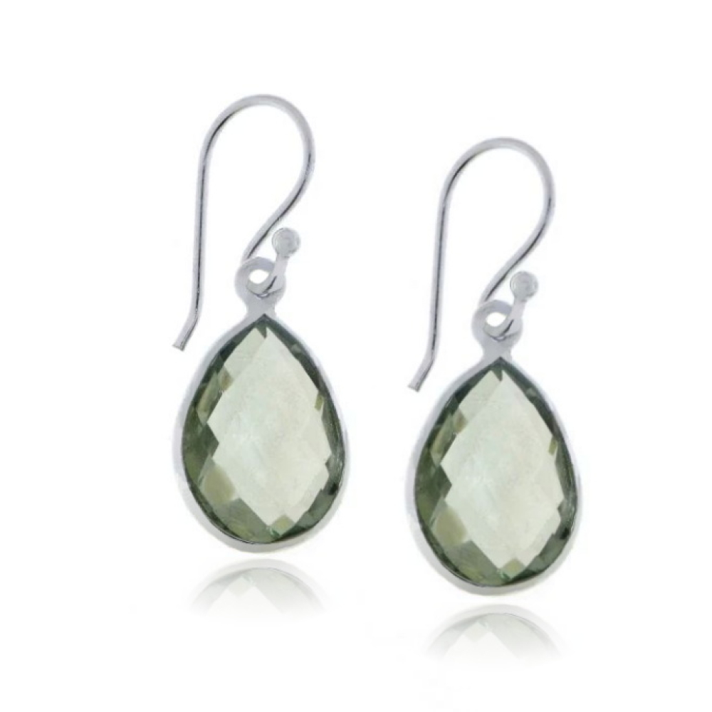 The silver hanging earrings have faceted cut gemstones. The gemstones are drop-shaped with a size of 16 x 10 mm.
