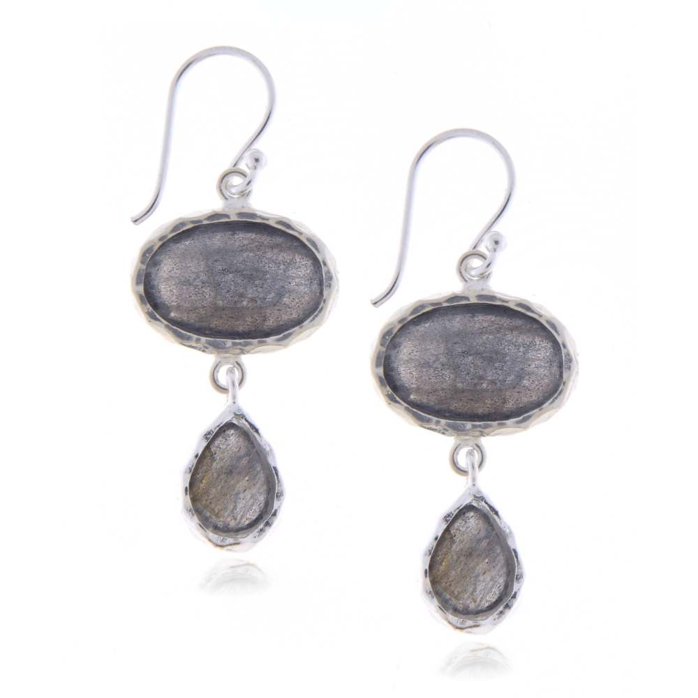 The silver earrings have cabouchon cut gemstones. The gemstones have a oval form 14 x 10 mm and a drop shaped with a size of 10 x 7 mm.