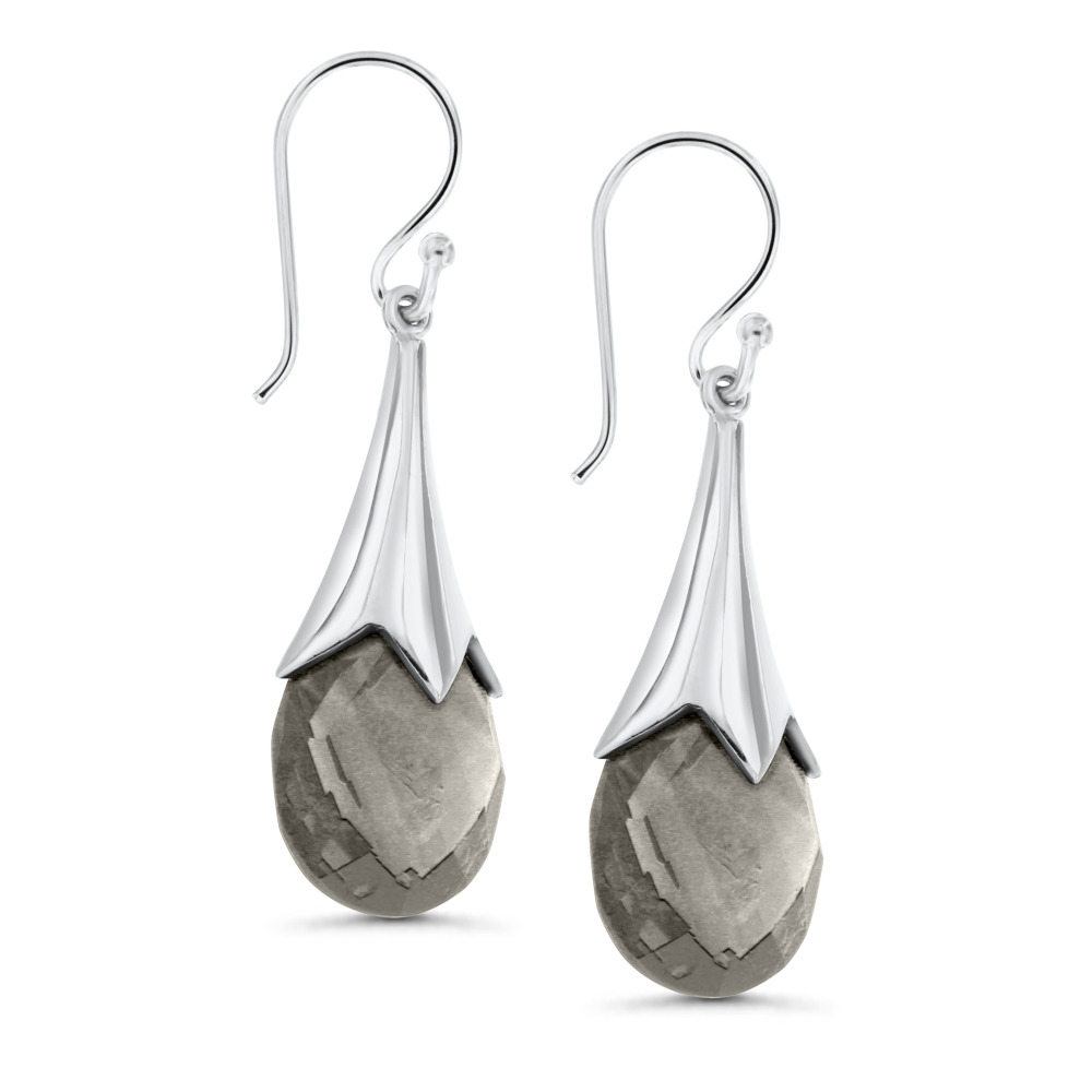 The silver hanging earrings have faceted cut gemstones. The shape of the gemstones are drop shaped with a size of 18 x 12 mm.
