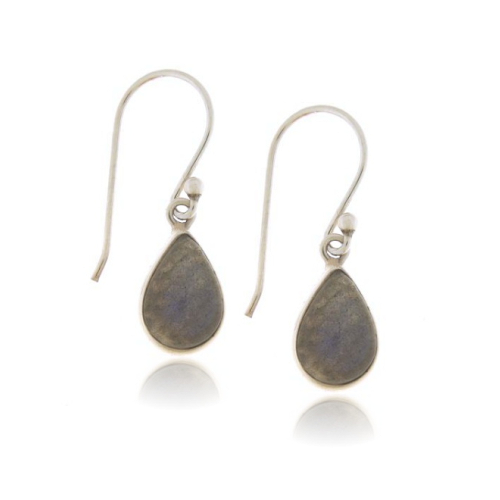 The silver hanging earring has cabouchon cut gemstones. The gemstones are drop-shaped, with a size of 11 x 8 mm.