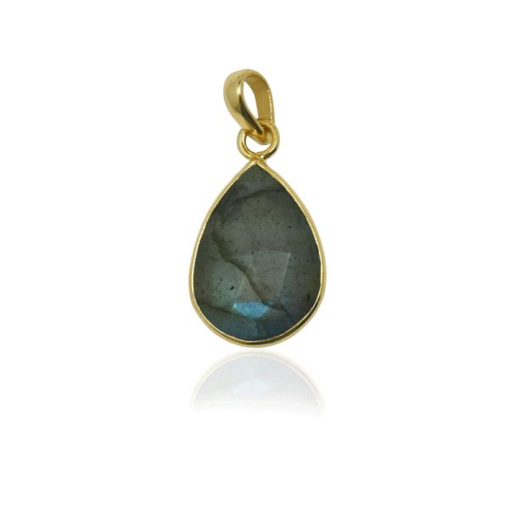 The goldplated pendant has a faceted cut gemstone. The gemstone is drop shaped with the size 14 x 10 mm.