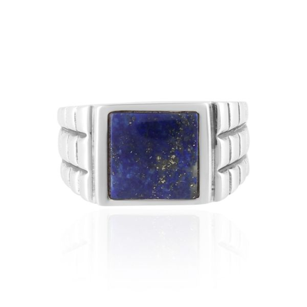 The silver man ring has a cabouchon cut gemstone. The gemstone has a square shape with a size of 10 x 10 mm.