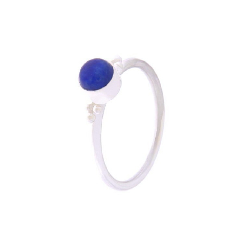 The silver ring has a cabouchon cut gemstone. The gemstone has around shape with a size of 6 mm.