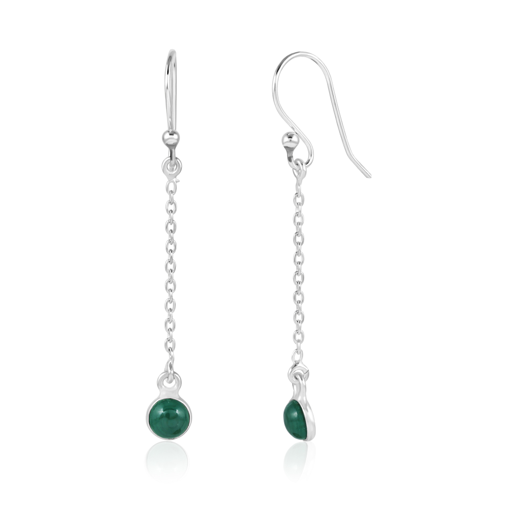 The silver hanging earrings have cabouchon cut gemstones. The gemstones are round, with a size of 5 mm.