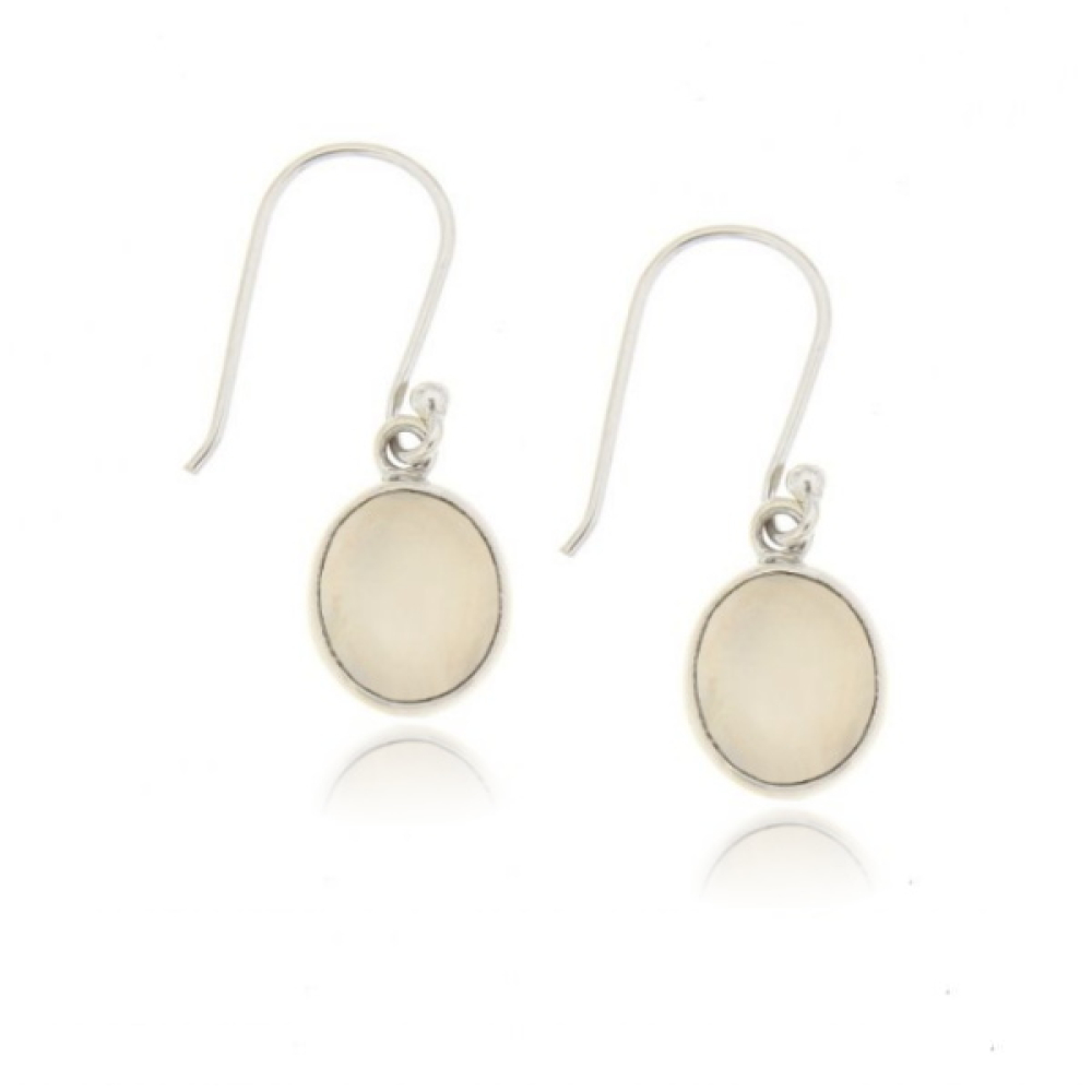 The silver hanging earrings have cabouchon cut gemstones. The gemstones are oval-shaped with a size of 10 x 7 mm.