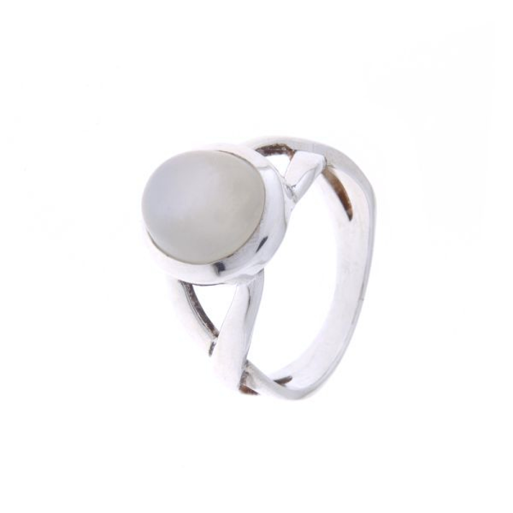 The silver ring has a cabouchon cut gemstone. The gemstone has an oval shape with a size of 12 x 10 mm.