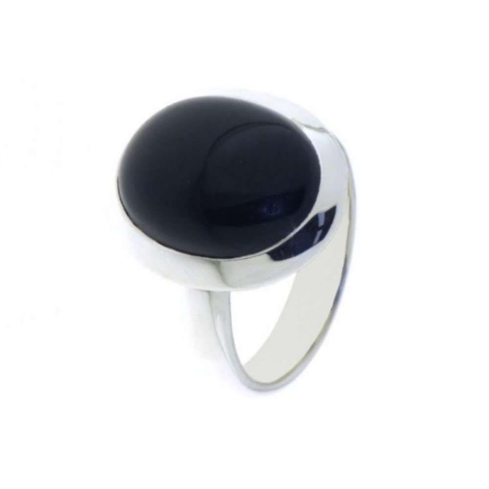 The silver ring has a cabouchon cut gemstone. The gemstone has an oval shape with a size of 16 x 12 mm.