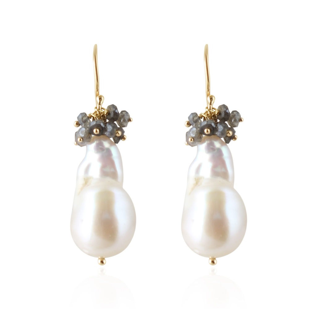 The 14 carat golden hanging earrings with faceted cut Labradorite. The shape of the pearls are drop shaped with a size of 18 x 12 mm.
