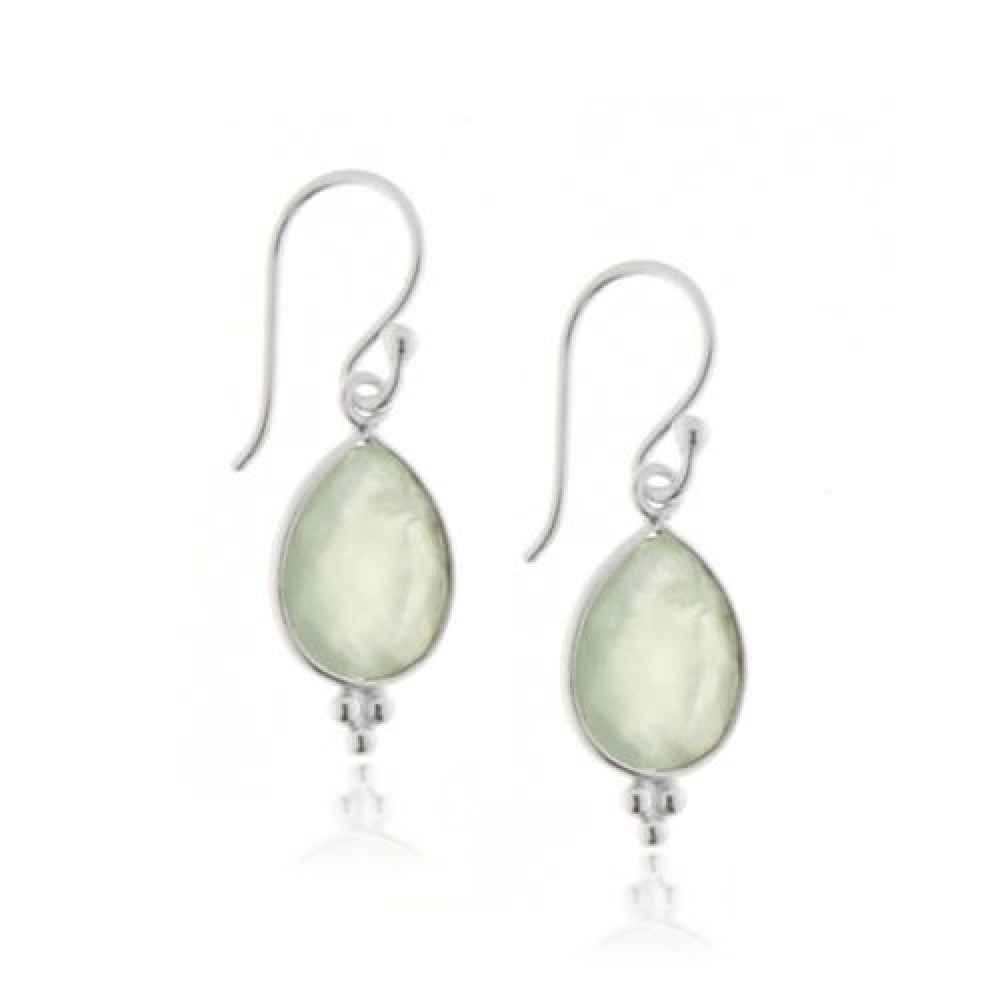 The silver hanging earrings have faceted cut gemstones. The shape of the gemstones are drop shaped with a size of 12 x 8 mm.