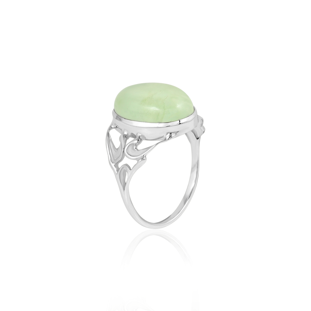 The ring has a cabouchon cut gemstone. The gemstone has an oval shape with a size of 14 x 10 mm.