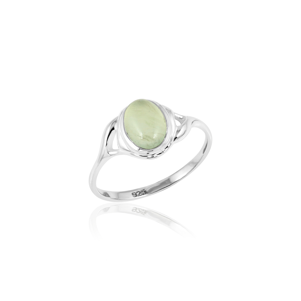 The silver ring has a cabouchon cut gemstone. The gemstone has an oval shape with a size of 8 x 6 mm.