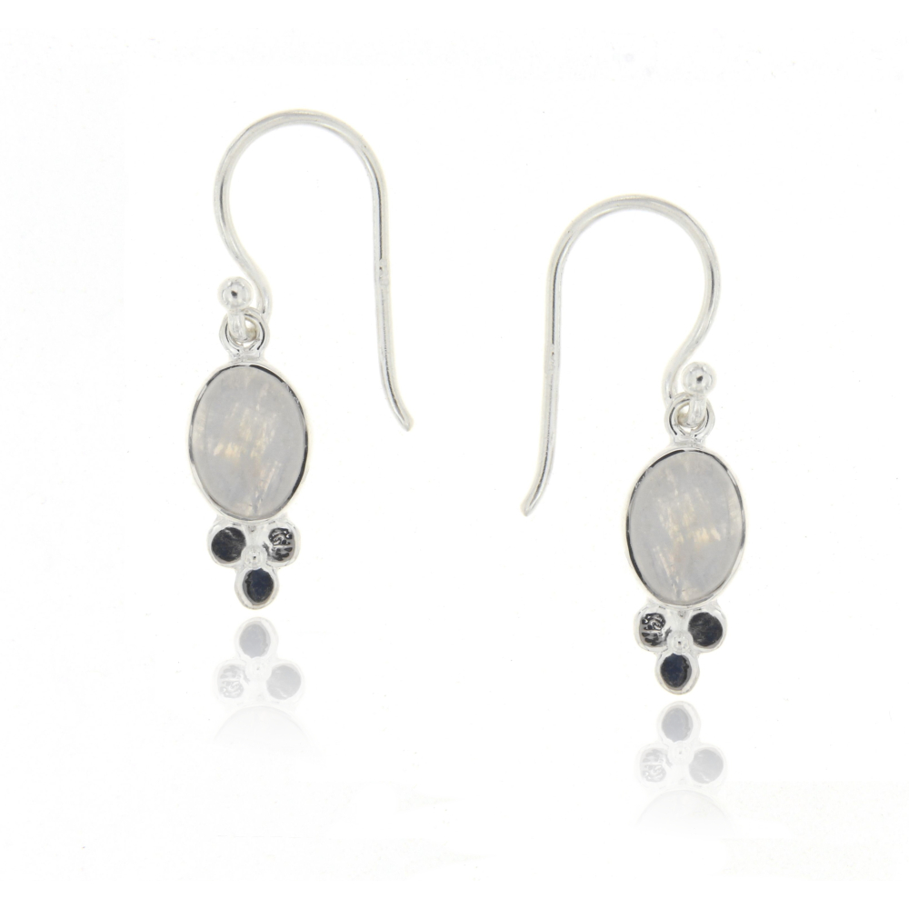 The silver hanging earrings have cabouchon cut gemstones. The shape of the gemstones is oval with a size of 8 x 6 mm.