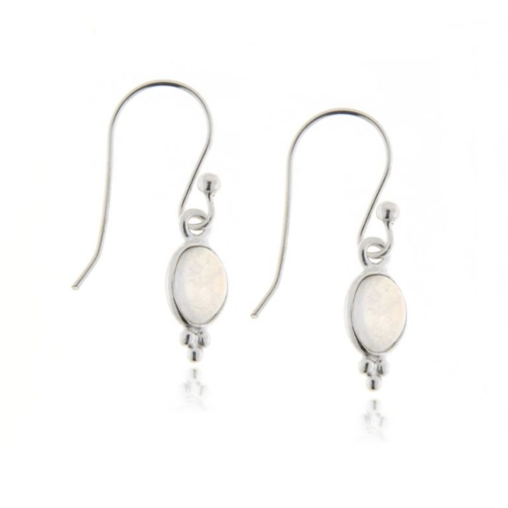 The silver hanging earring has cachouchon cut gemstone. The gemstone has a oval shape with a size of 7 x 5 mm