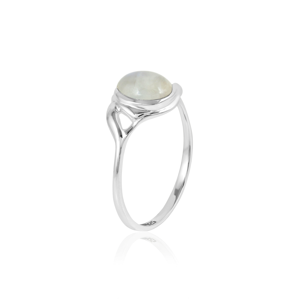 The silver ring has a cabouchon cut gemstone. The gemstone has an oval shape with a size of 8 x 6 mm.