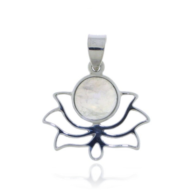 The silver lotus flower pendant has a cabouchon cut gemstone. The shape of the gemstone is round with a size of 10 mm.