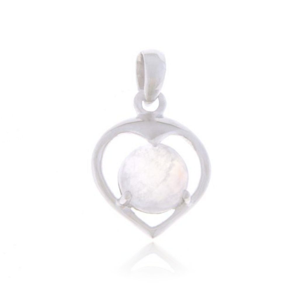 The silver heart shaped pendant has a cabouchon cut gemstone. The shape of the gemstone is round with a size of 10 mm.