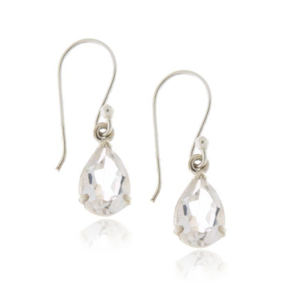 The silver hanging earrings have faceted cut gemstones. The gemstones are drop form with a size of 9 x 7 mm.
