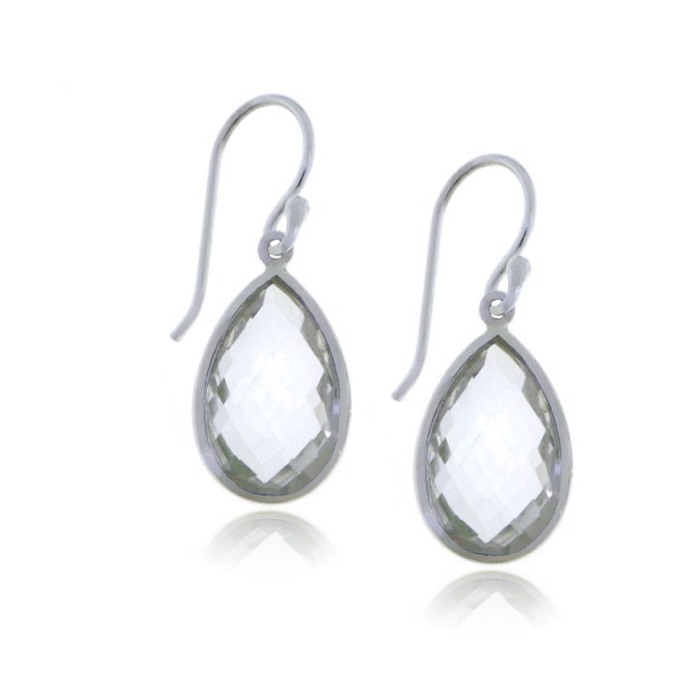 The silver hanging earrings have faceted cut gemstones. The gemstones are drop-shaped with a size of 16 x 10 mm.