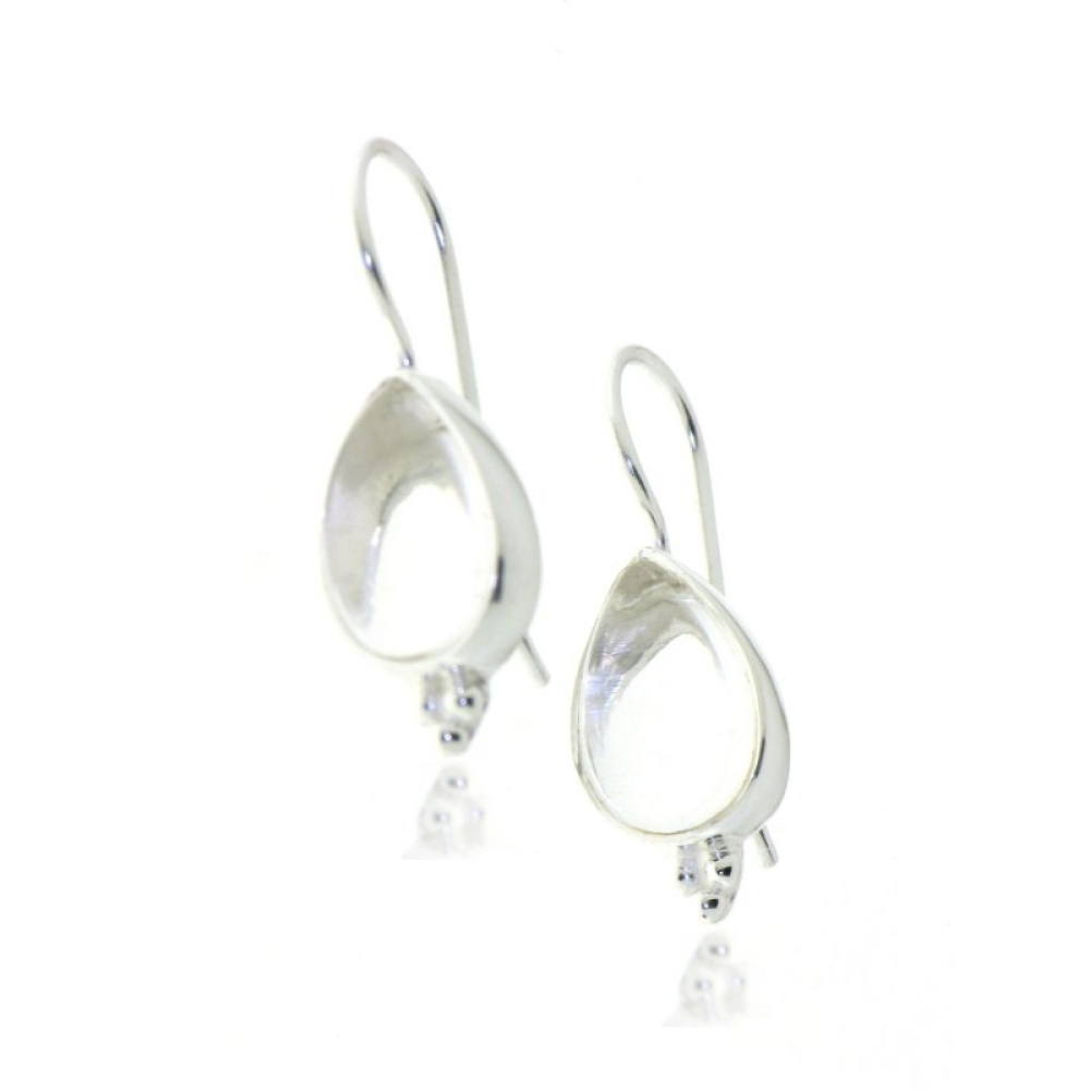 The silver hanging earrings have cabouchon gemstones. The shape of the gemstones are drop shaped with a size of 12 x 8 mm.