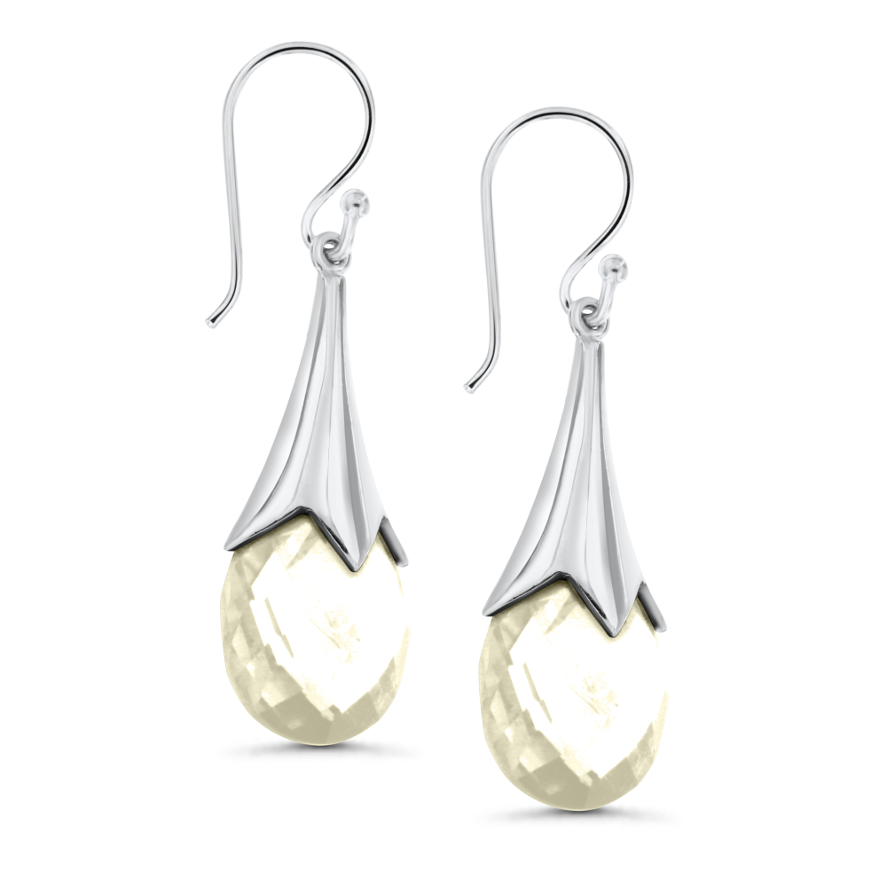 The silver hanging earrings have faceted cut gemstones. The shape of the gemstones are drop shaped with a size of 18 x 12 mm.