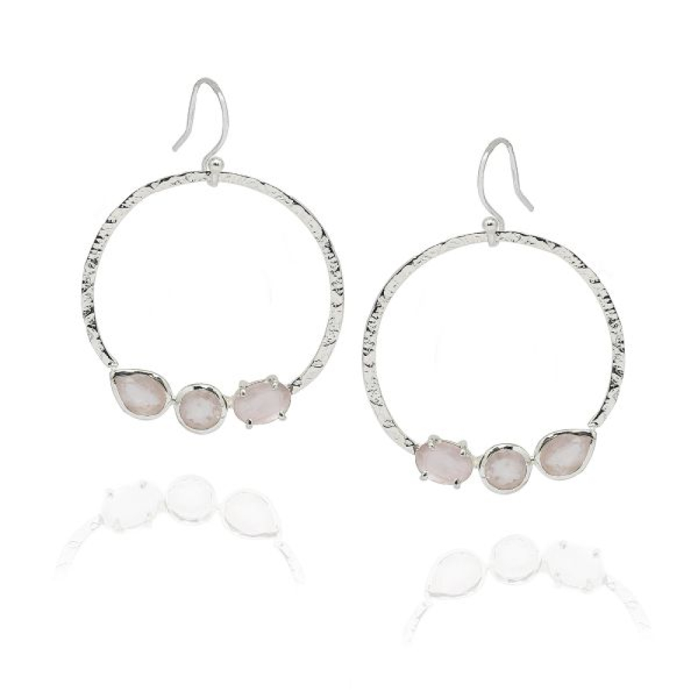 The silver hanging earrings have faceted cut gemstones. The gemstones are oval, drop shaped and round with a size of 7 x 5, 7 x 5 and 6 mm.