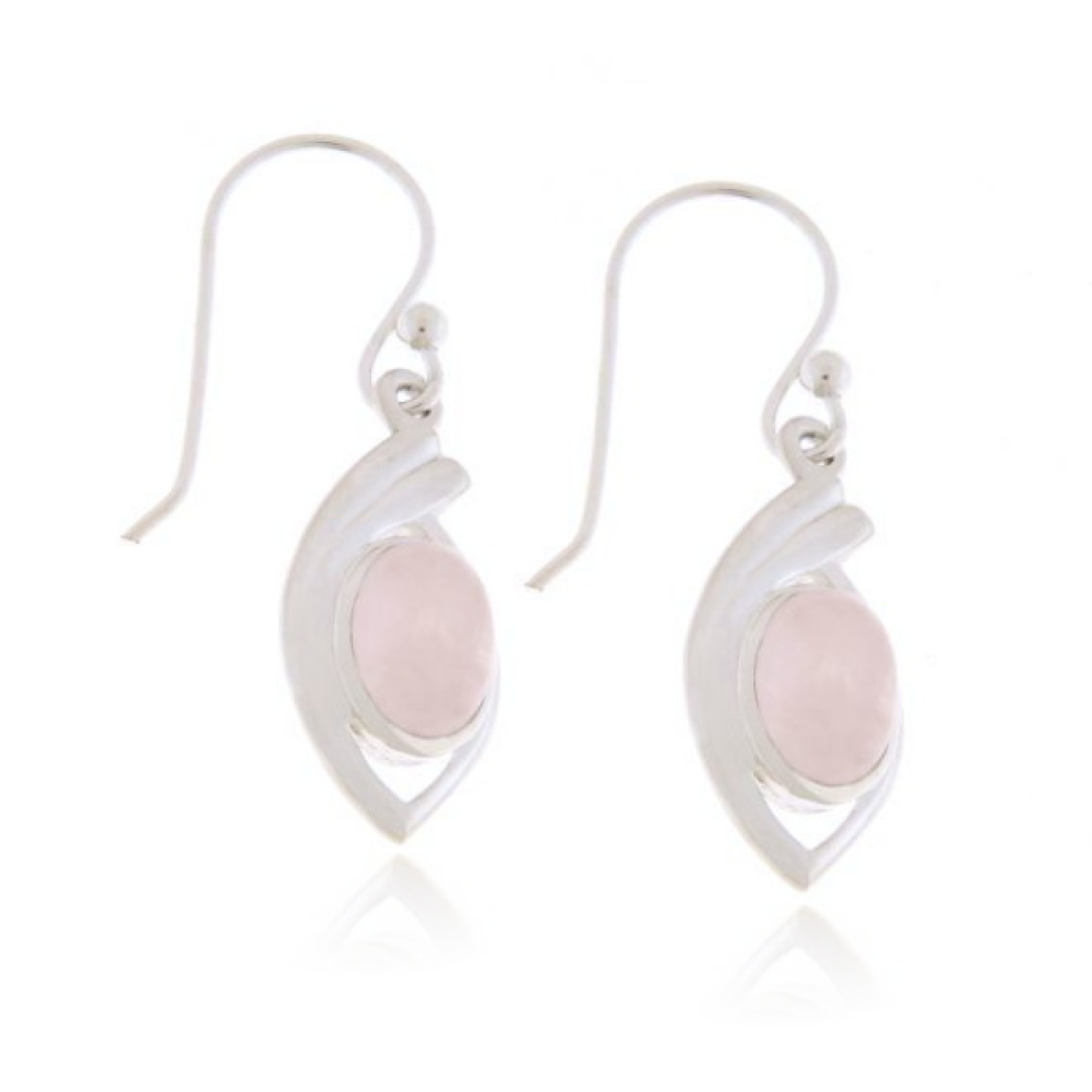 The silver hanging earrings have cabouchon cut gemstones. The gemstones are oval-shaped with a size of 10 x 7 mm.