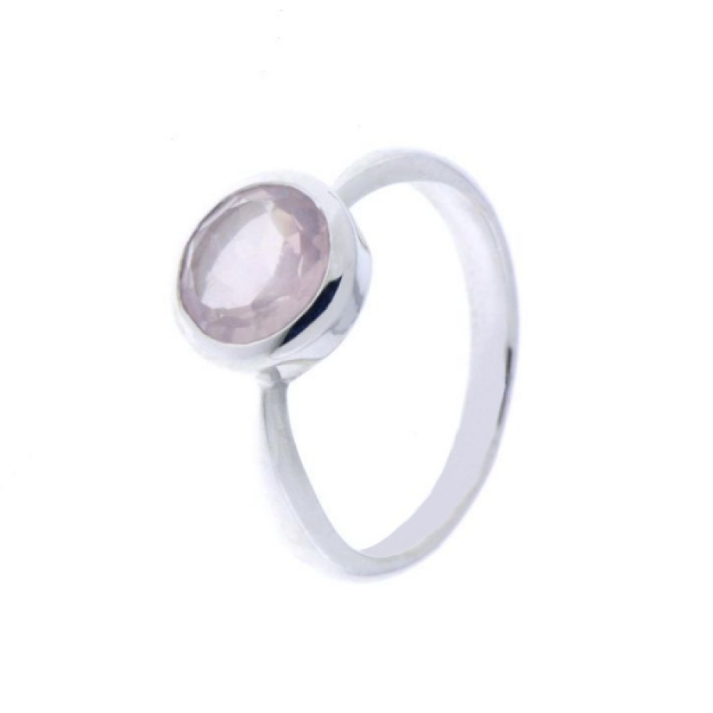The silver ring has a faceted cut gemstone. The gemstone has a round shape with a size of 8 mm.