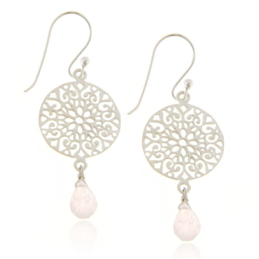 The silver hanging earrings have faceted cut gemstones. The shape of the gemstones are drop shaped with a size of 9 x 6 mm.