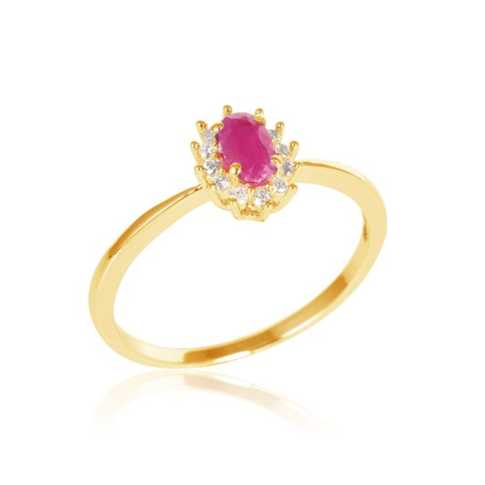 The 14 carat golden ring has a faceted cut gemstone. The shape of the gemstone is oval with a size of 6 x 4 mm.