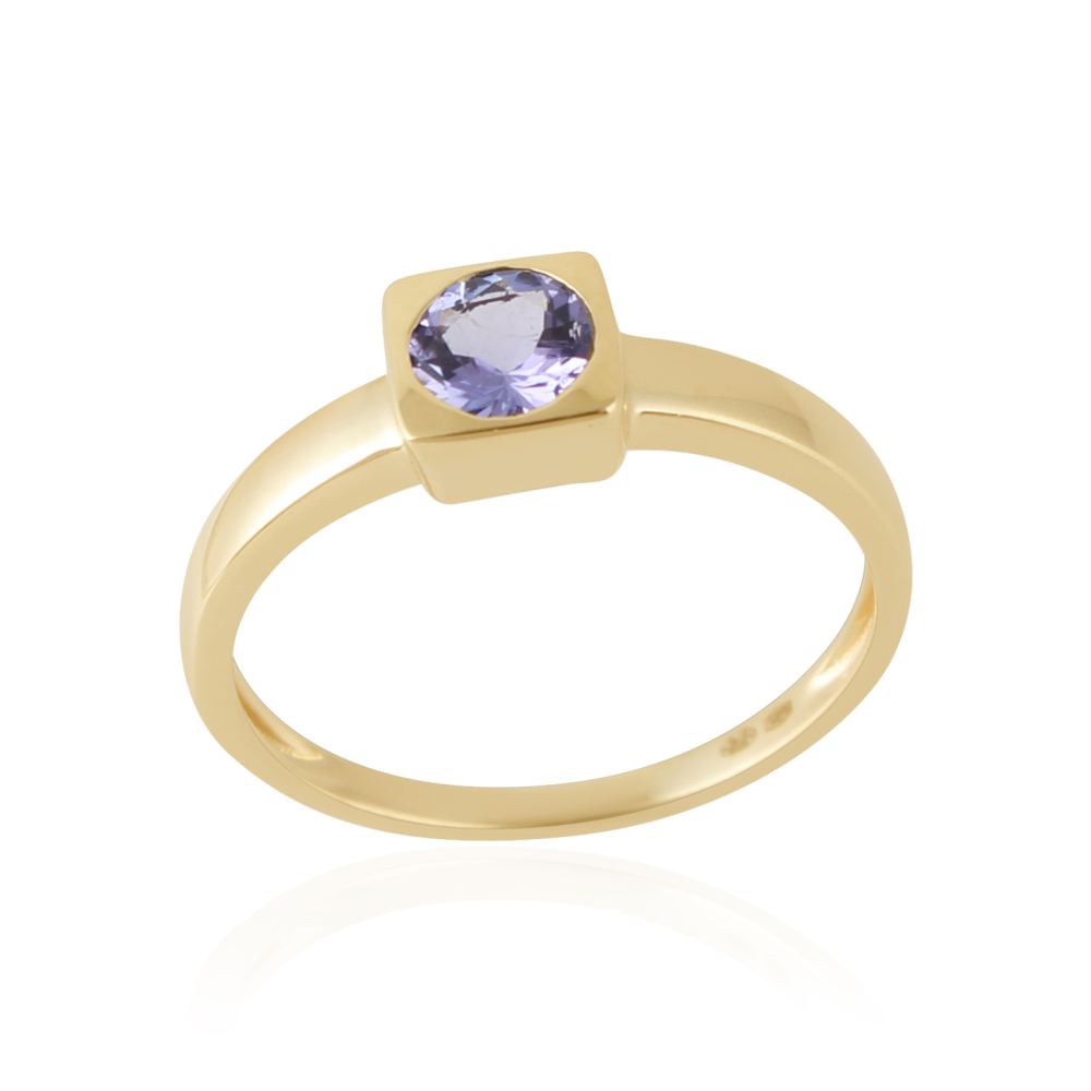 The 14 carat golden ring has a faceted cut gemstone. The shape of the gemstone is rond with a size of 5 mm.