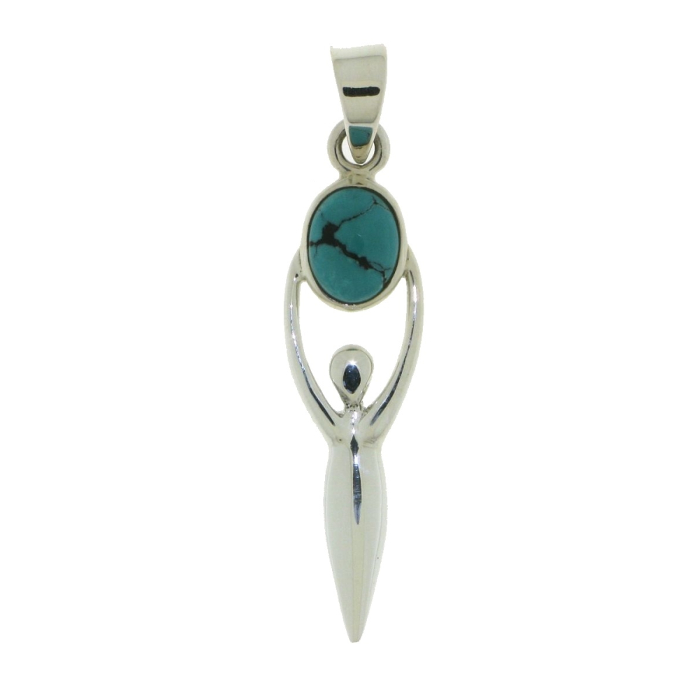 The silver goddess pendant has a cabouchon cut gemstone. The shape of the gemstone is oval with a size of 9 x 7 mm.
