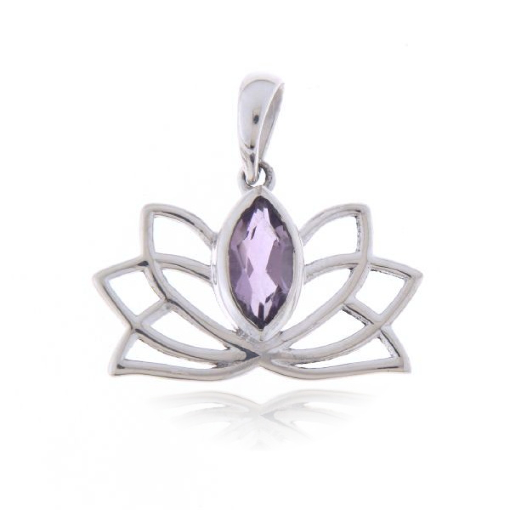 De zilveren lotusbloem hanger heeft een facet geslepen edelsteen. De vorm van de edelsteen is marquise vormig met een afmeting van 10 x 5 mm. In het Boeddhisme is de Lotus het symbool voor het inzicht dat tot verlichting leidt.